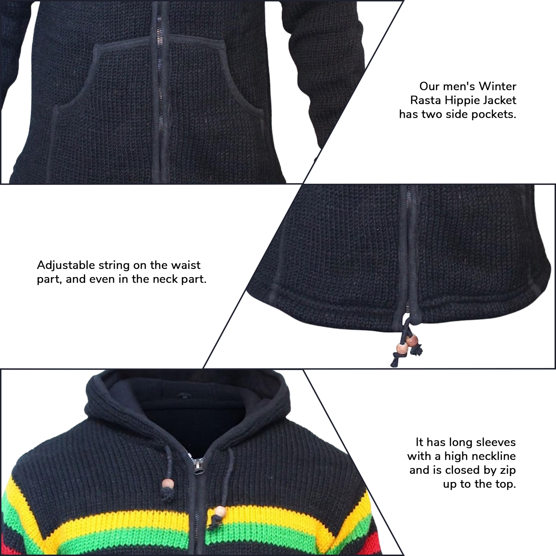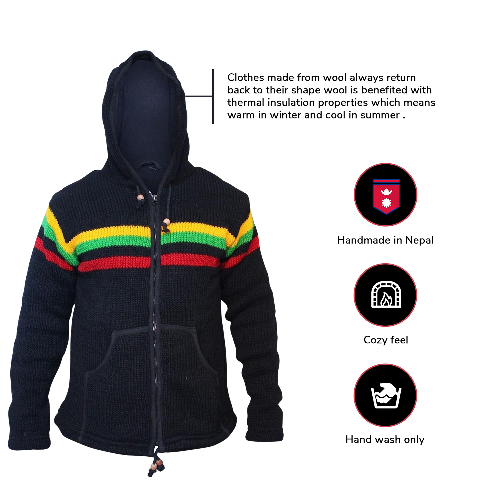This woolen rasta jacket is fully lined, zips up, and has two side pockets. Also, this hooded jacket is knitted only in plain colors. A large front kangaroo pouch pocket for all of your storage needs. It is made of high-quality materials, durable enough for your daily wearing. Lightweight and comfortable to wear during traveling. Stylish design with highest wearing comfort and ease of maintenance.