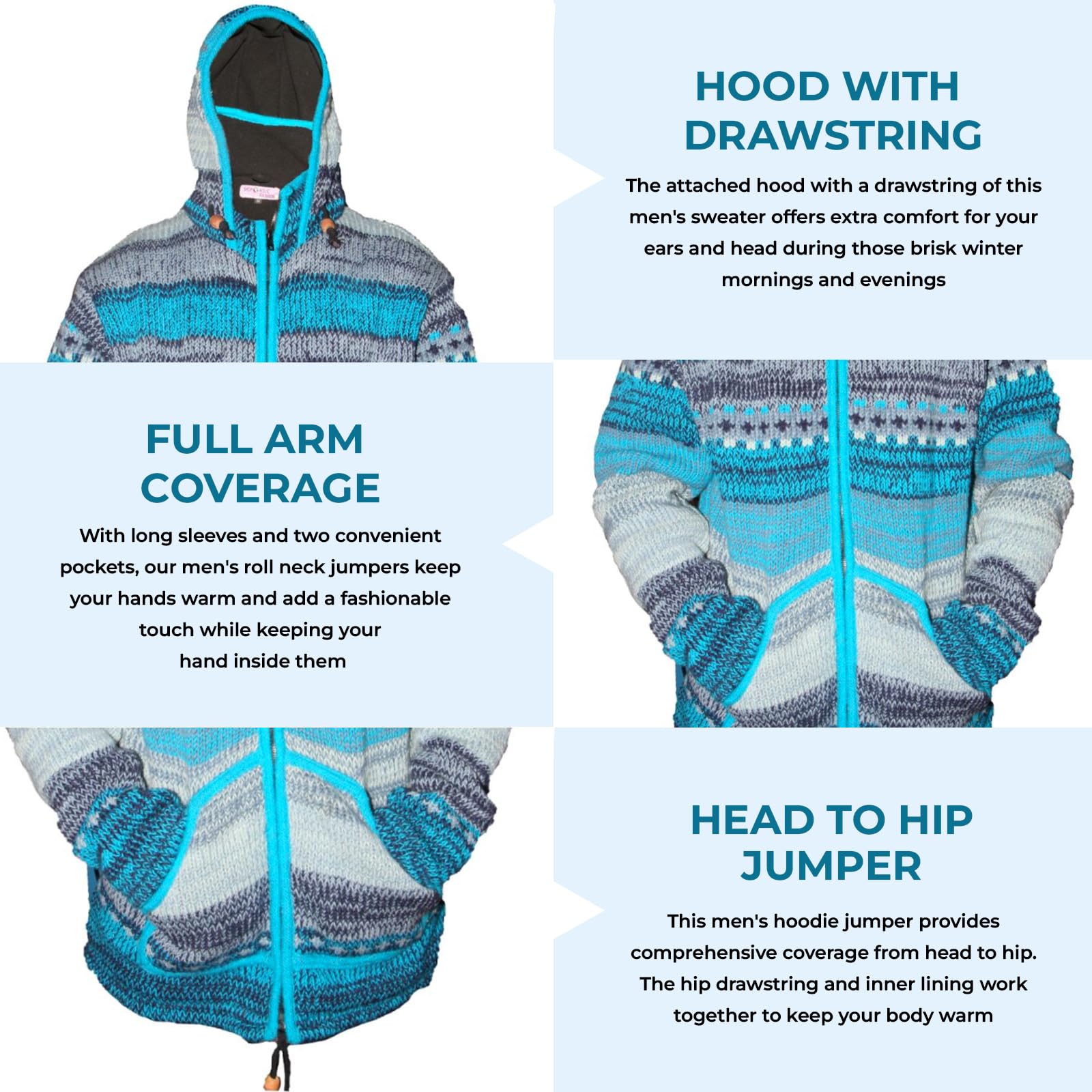 Stay cosy and stylish this winter with this Tie Dye Zip-Up Jumper, the must-have addition to your cold-weather wardrobe. Crafted for those who crave both comfort and fashion, this tie-dye rainbow-patterned knitted jumper boasts a natural woollen exterior that not only feels wonderfully soft against your skin but also ensures you stand out in style wherever you go. With its high-neck coverage, extending up to envelop a significant portion of your neck, you'll stay warm and protected from the chill. The front zip closure adds convenience to your dressing routine, making it effortless to put on and take off. Embrace the frosty mornings and evenings with the attached hood, complete with a drawstring for a snug fit. Our winter jumpers for men are designed with long sleeves and two pockets, ensuring that your hands stay toasty and adding an extra touch of flair to your outfit. Our hooded sweatshirt offers full head-to-hip coverage, and the hip drawstring, along with the cosy inside lining, ensures that you'll be enveloped in warmth, making it your ultimate winter protection attire.